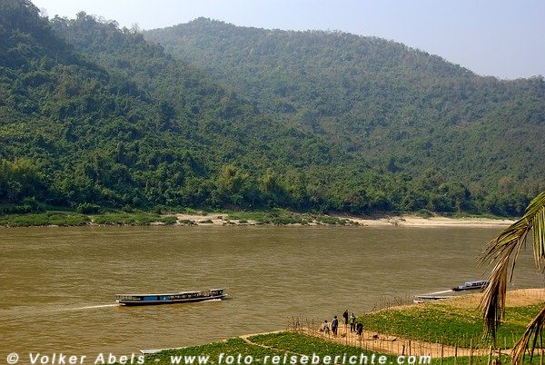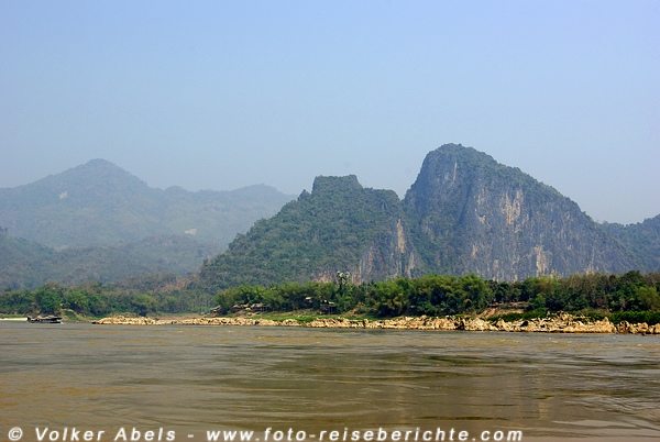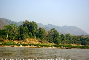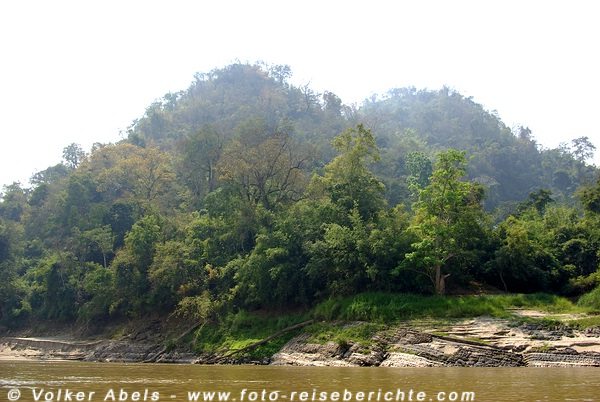 Vorbei an mit Wald bedeckten Bergen, kultiviertes Land und immer wieder zwischen dicken Felsen hindurch. Auch Gärten, die am Ufer des Mekong jedes Jahr errichtet werden, waren zu sehen. Hin und wieder erkannte ich Menschen, die am Fluss sitzen oder aber Herden von Wasserbüffel, die am Ufer nach Futter suchten