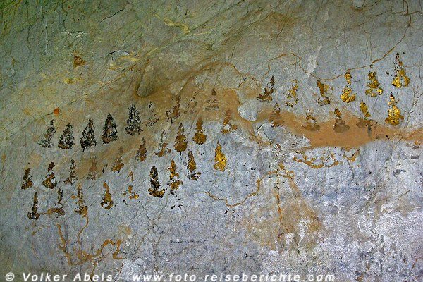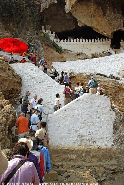 Allzu lange hielt ich es in der Höhle nicht aus. Ich beschloss die zweite Höhle, die etwa 200 Meter höher im Berg lag, zu besichtigen. Man gelangt über Treppen den Berg hinauf. An den Treppen saßen Frauen und Kinder und verkauften Bananen und Getränke. Wer wollte konnte auch für ein paar Kip Vögeln die Freiheit schenken, was Glück bringen soll. Vielleicht stimmte das wirklich, denn Glück hatten die Frauen, die vielen Vögeln die Freiheit schenken und das Geld kassieren konnten. Nach kurzer Zeit kamen die Vögel freiwillig wieder zurück in ihren Käfig.