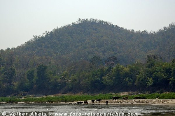 Nach dieser Unterbrechung ging es noch etwa 30 Minuten weiter. Unser Boot kreuzte von einem Ufer zum gegenüberliegenden Ufer quer über den Fluss und wieder zurück. Der Grund war der geringe Wasserstand im Februar. Alle Boote mussten bestimmte Fahrrinnen nutzen, um nicht auf Felsen zu laufen oder auf Sandbänken zu stranden oder aber in diversen Stromschnellen zu kentern.