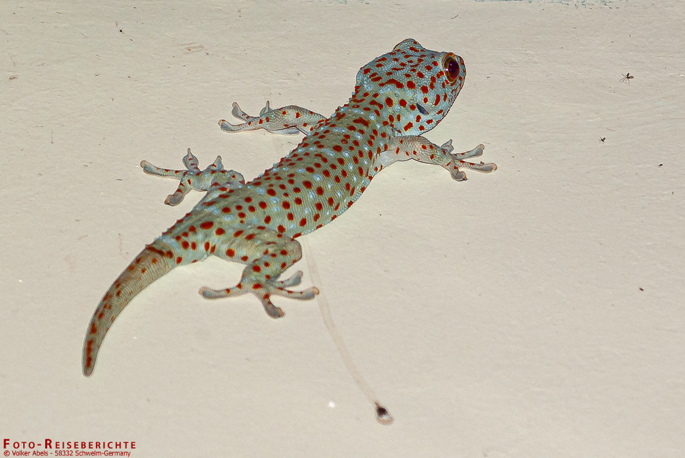 Hier ist noch ein Foto von einem Tokee bzw. Tokeh. Diese Tiere gehören auch zu den Geckos, sind aber größer als die o.a. Geckos. Tokehs können bis zu 35 cm groß werden. Sie sind nicht unbedingt Mückenjäger, sondern sie fressen eher größere Insekten, aber auch Mäuse oder andere Tiere, die sie überwältigen können. Neben der Tatsache, dass sie ziemlich laut sein können, spricht auch sonst nicht viel dafür sie im Zimmer zu haben.
