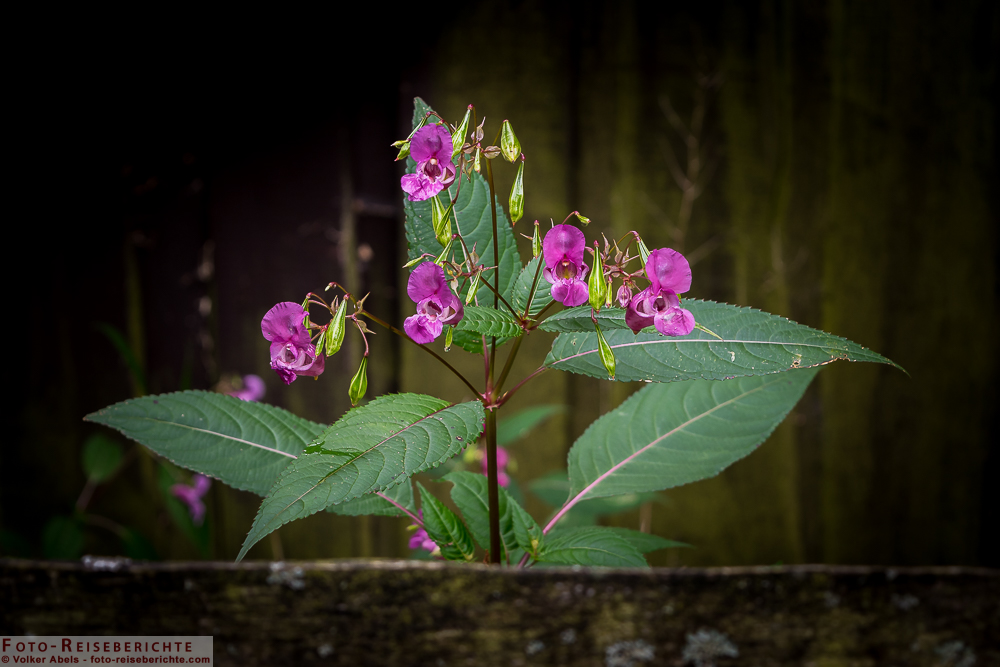 Meistens wachsen die Indischen Springkräuter in mehr oder weniger großen Kolonien. Vielleicht fiel mir deshalb die einzeln stehende Pflanze bei einem kleinen Spaziergang auf.