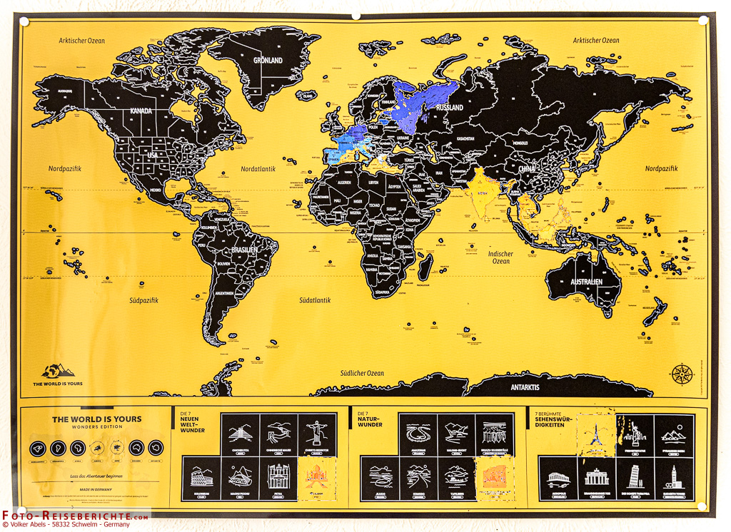 Wasilios, der Gründer von The World Is Yours, hat mir hierfür eine Rubbel Weltkarte zur Verfügung gestellt. Ich habe sie sofort aufgehängt und die Länder in denen ich schon gewesen bin, frei gerubbelt.